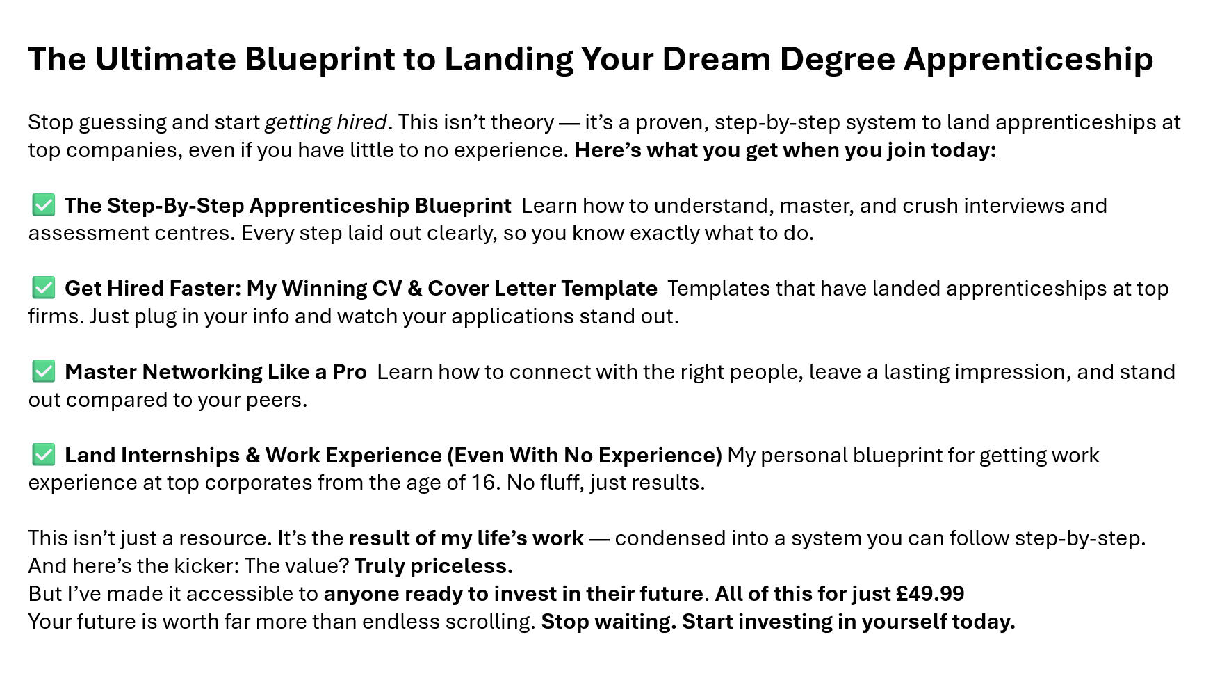 ✅ You’ll start your career in finance early, while your peers are still figuring things out.Don’t wait until it’s too late. I started at 16, and it changed my life. This course is your shortcut to doing the same — landing your apprenticeship, standing out from the competition, and building the career you deserve. Enroll now.